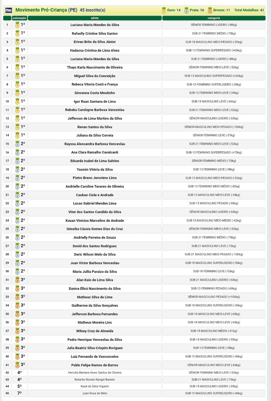 O Movimento Pró-Criança deu início à caminhada rumo ao hexacampeonato estadual de judô com 41 medalhas conquistadas a primeira fase do Campeonato Pernambucano da modalidade. No torneio, que aconteceu no último sábado dia (1º), no Colégio São Bento, em Olinda (PE), os atletas da ONG ganharam 14 ouros, 16 pratas e 11 bronzes. O resultado coloca a instituição no segundo lugar geral no ranking até o momento.