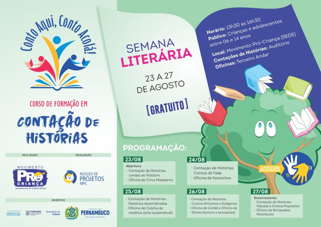 Contação de histórias e oficinas gratuitas para meninos e meninas com idades entre 6 e 14 anos estão na programação da Semana Literária, que começa nesta segunda-feira (23), no Recife. O evento é realizado pelo Movimento Pró-Criança, por meio do projeto “Conto aqui, conto acolá!”, uma iniciativa da ONG com o apoio do Fundo Pernambucano de Incentivo à Cultura (Funcultura).