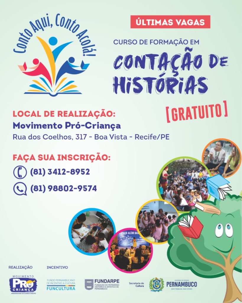 O Movimento Pró-Criança está com as últimas vagas abertas para o curso gratuito de contadores de histórias. A formação faz parte do projeto “Conto aqui, conto acolá!”, iniciativa da ONG com o apoio do Fundo Pernambucano de Incentivo à Cultura (Funcultura).